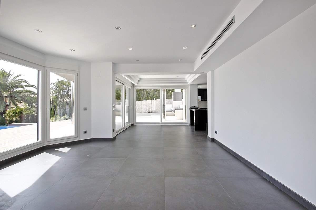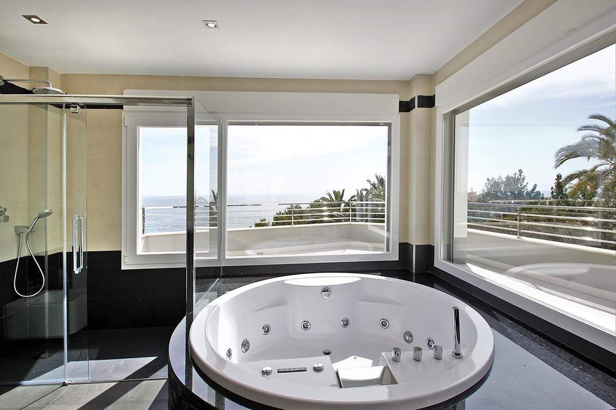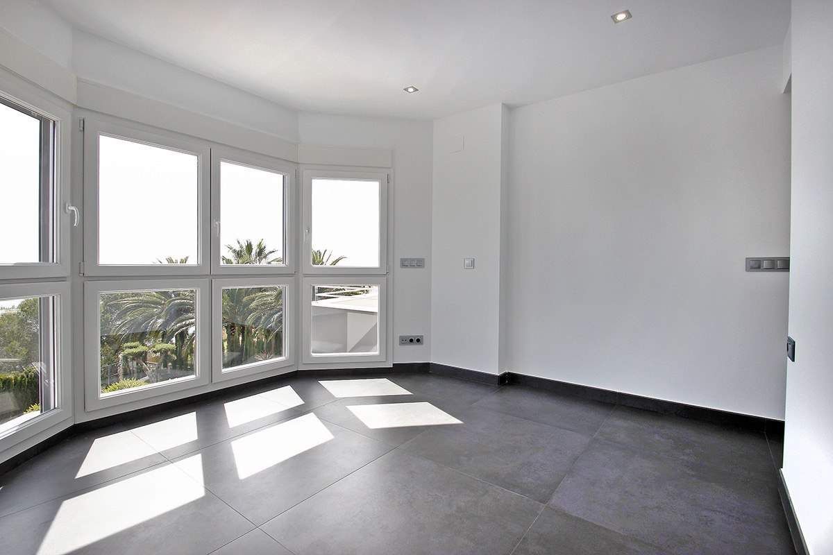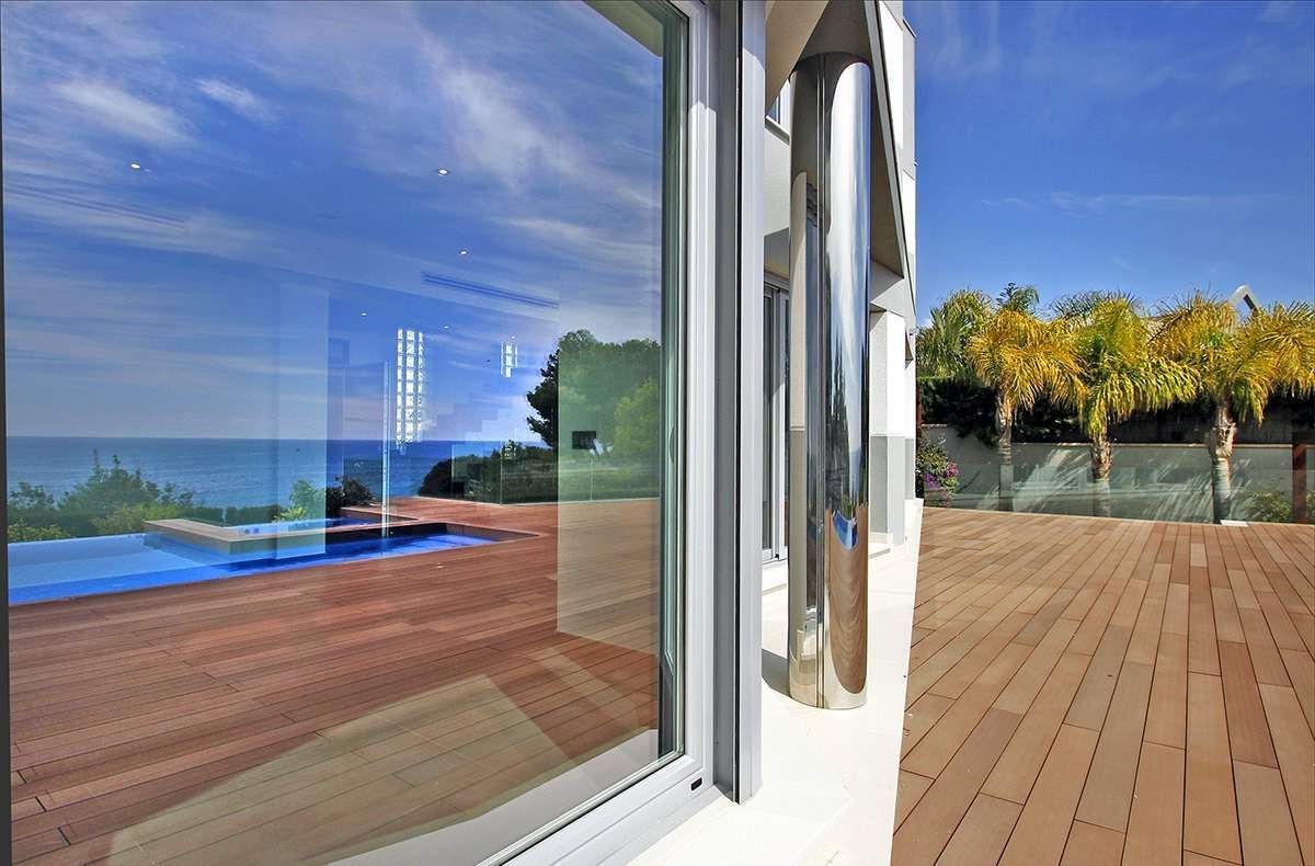 Brand new luxury villa for sale in Calpe, in urbanization Calalga. This luxury villa of contemporary design is located on a first line plot with direct sea access. This exclusive plot has an area of 1. 300 m2 and the villa has a floor area of 520 m2 on 2 floors + basement (spa), as follows: 5 bedrooms, 6 bathrooms (5 en-suite) + 1 guest toilet, fully fitted kitchen, dining room and large living room + nice porch (covered terrace). Enjoy large outdoor terraces, (+200 m2), where we have an impressive pool with endless effect (+ integrated Jacuzzi area) and a nice barbecue. This villa was built in year 2014 and stands out for its design, finishes and quality materials and for its impeccable execution of work. It is equipped with underfloor heating system and central ducted air-conditioning. In the basement we have a spa area with a heated indoor pool (8 x 3,5 meters), gym, bathroom, cinema room and wine cellar. The garden is beautiful and low maintenance (automatic irrigation system). It also has ample parking areas with a double pergola. Undoubtedly we are facing one of the most exclusive villas on the Costa Blanca.