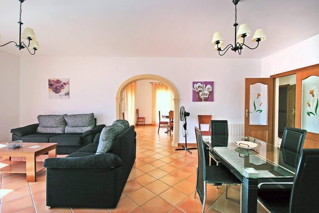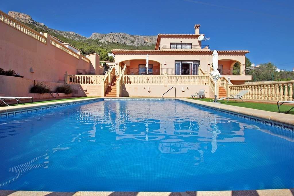 Villa for sale in Calpe, in urbanisation Currares. This villa enjoys spectacular panoramic views to the sea and to the Peñón de Ifach. It is located on a plot of 1. 650 m2 and has a total area of 350 m2 distributed in 2 floors as follows: on the main floor we have a spacious entrance hall, 2 bedrooms with fitted wardrobes, (15 m2 - 15 m2), 1 bathroom, 1 toilet, kitchen of 20 m2 with laundry room, dining room of 25 m2, living room of 40 m2 with fireplace and large porch area (covered terrace), with 35 m2. Upstairs we have the master bedroom with a dressing room, an en-suite bathroom, (with jacuzzi), and 2 private terraces of 15 m2 each. This villa has several terraces. I would highlight the main one, with 100 m2, which is covered with artificial grass and where we also find a 10x5 meters pool. This villa is in perfect condition, with high quality finishes and is notable for the spaciousness. It is equipped with central heating and air conditioning preinstallation. In the basement we have a multipurpose room of 40 m2 and a large double garage of 40 m2 connected by an internal staircase to the main floor. It also has large areas of parking for several vehicles. It has a nice garden with automatic irrigation system.