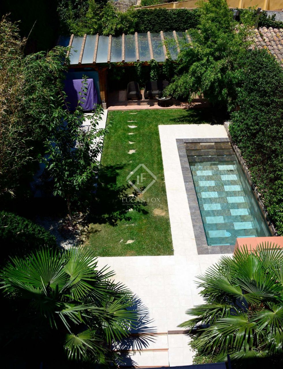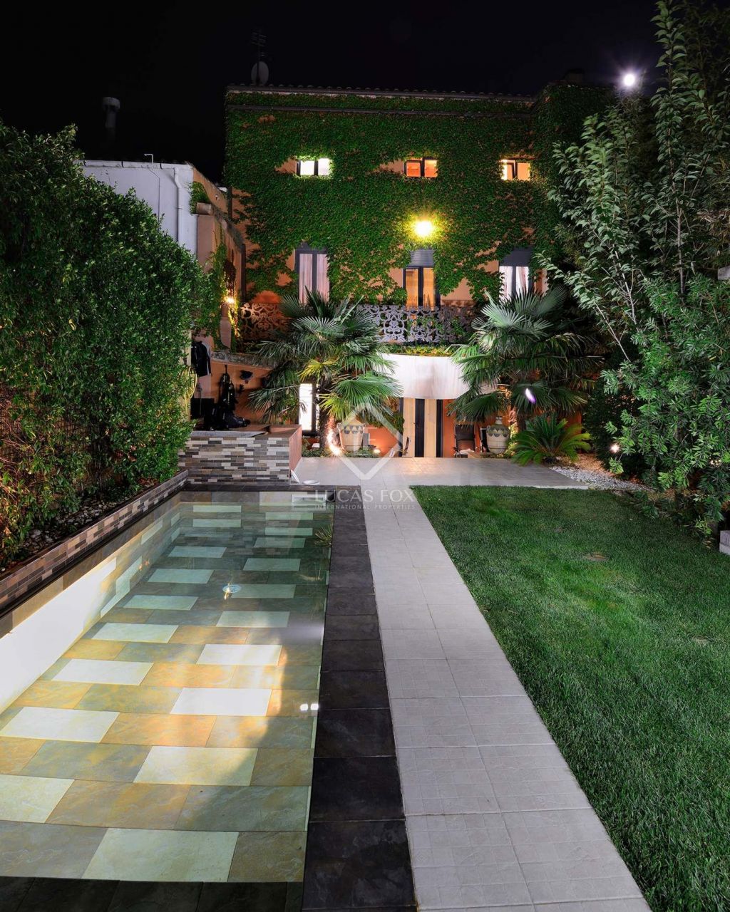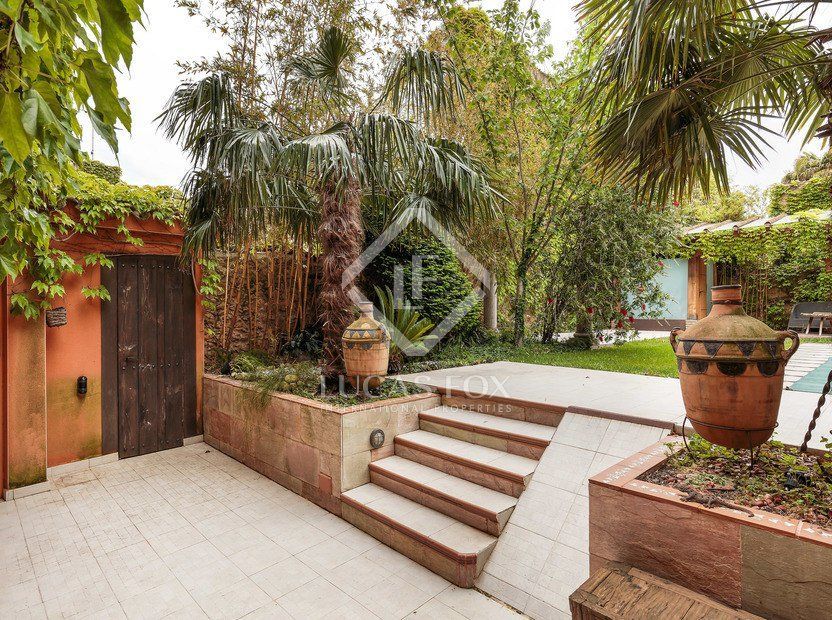 The 160 m² garden has 3 varieties of bamboo and virgen vines covering several walls. It is organised into different areas including a space for outdoor dining, a games area and a barbecue and the patio features a restored 200-year-old chestnut wood door. The wooden porch has a glass storage room and there is a tool room and pool machinery room. Exterior lighting is provided for different areas and the original utility area has been renovated and features an electric fountain.
