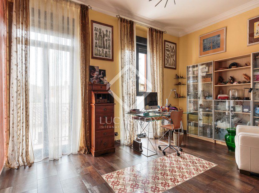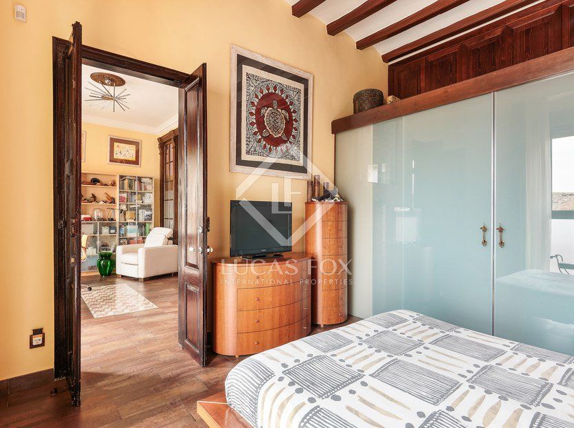 The second floor accommodates 4 bedrooms, including a bedroom suite with a dressing room, a bedroom – study with large windows, a double guest bedroom and a further double bedroom with wardrobes and washing machine and dryer. The main bathroom with original glass panes and music installation and a guest bathroom with natural light from a skylight are also on this floor. The front balcony offers views of Plaza del Tambor and the rear balcony features a bespoke handrail.