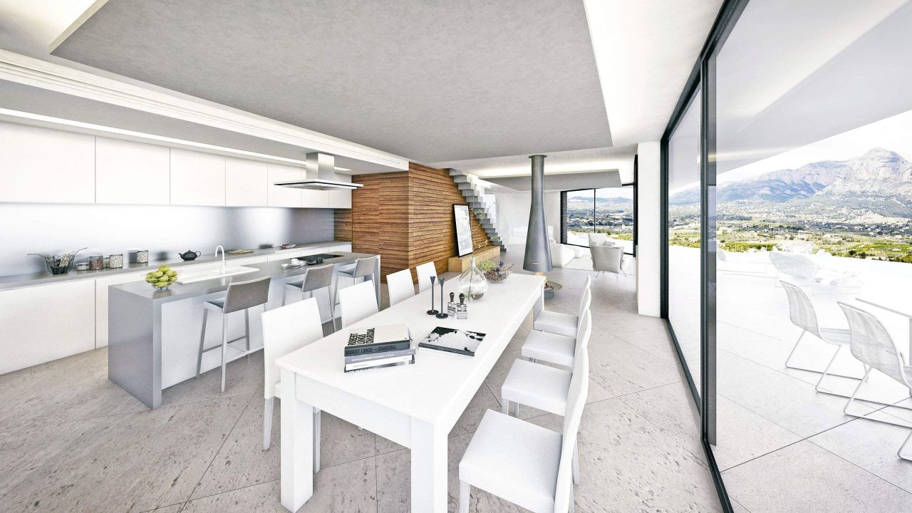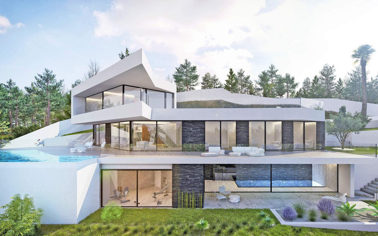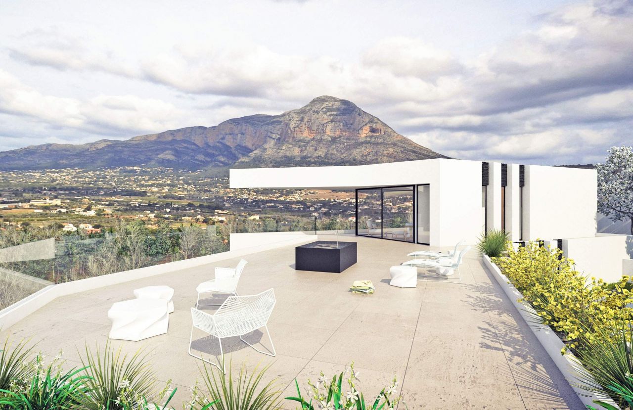 If you're looking for an modern villa Ibiza style in Javea, why not build it? Take this design of a new construction villa which includes a fabulous plot located on El Rafalet which has stunning views across the valley to the Montgo and down the valley toward Gata and stretching toward Valencia. The package includes architects plans, licenses, build and pools. The villa has been designed to enjoy the view from all aspects, by creating transparent walls which slide open to give pool-side access directly from the lounge-diner with incorporated modern fitted kitchen. There are 4 double en-suite bedrooms all with fitted wardrobes. Extras include: underfloor heating, home automation system, home cinema room, gym, indoor pool, large private garage with automatic door, beautiful infinity pool with terrace and roof terrace. It's a fabulous opportunity to aquire a new build villa in Javea with all mod-cons and excellent view.