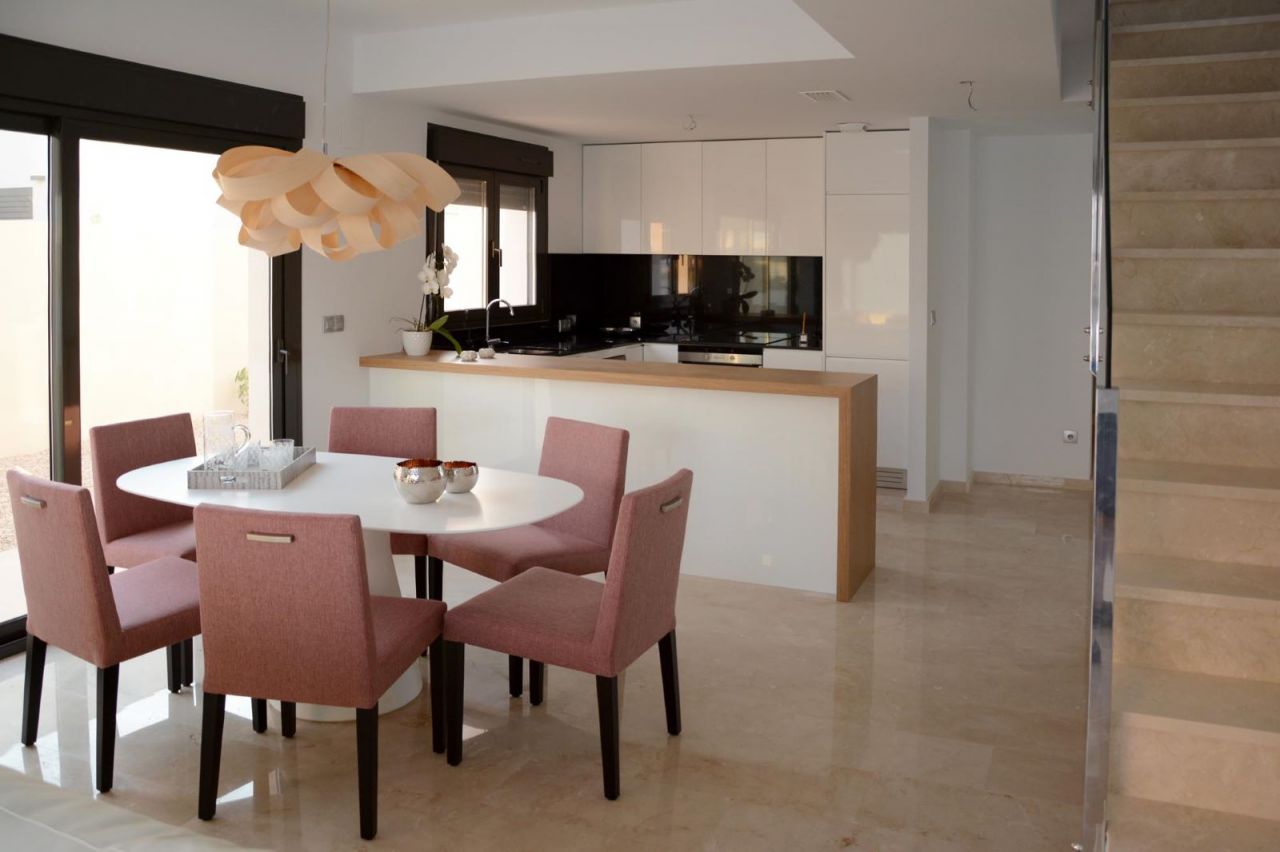 2-хэтажная вилла в современном стиле в Лос-Дольсес, Ориуэла-Коста. Салон с американской кухней, 3 спальни, 2 ванные комнаты, солярий 35 м2. Общая площадь 127 м2. Сад и частный бассейн на участке в 370 м2.