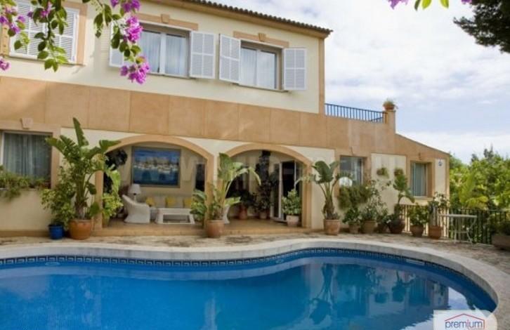 We present to your attention a villa in Calvia. 6 bedrooms, 5 bathrooms, living room with fireplace, large kitchen with dining room, dressing room, office, marble floors, heating, air conditioning. Gardens, verandas, swimming pool, barbecue, gym, library, cellar, 2 garages, 2 parking spaces, double glazing. Beautiful views. Quiet area. The plot is 961 m2. Distance to the sea 1 km. The nearest airport is 30 km.