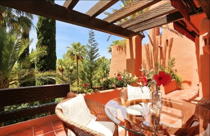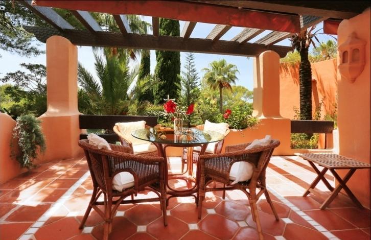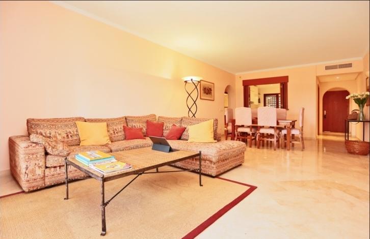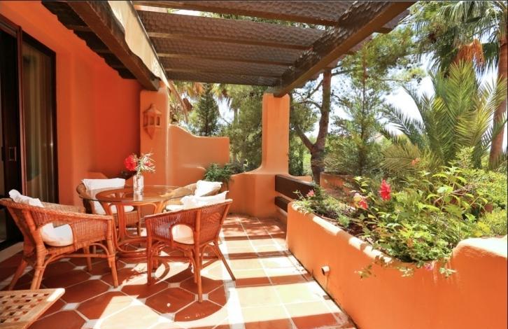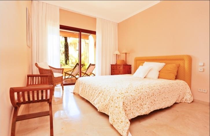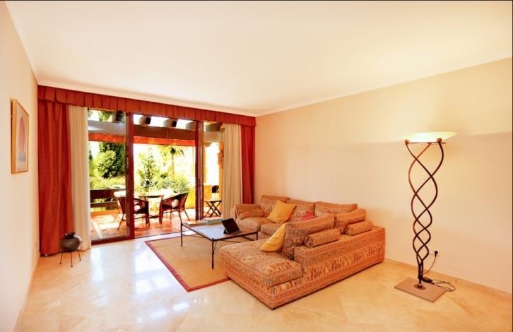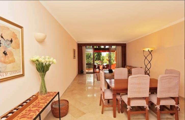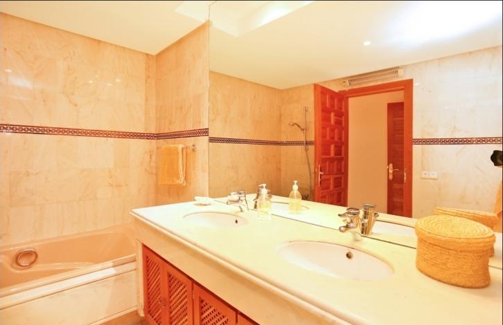 Stylish spacious apartment in a luxury residential complex in Nova Santa Ponsa, a sought after area in the south west coast of Mallorca. The living area of 119 sqm is composed by an ample living room with lounge zone and dining table, a separate fully equipped kitchen with utility room, 2 bedrooms, and 2 bathrooms. From the living room and one of the bedrooms you may get to the spacious terrace of 25 sqm under the wooden roof with beams. The terrace is equipped with rest and dining areas and is perfect for relaxing while enjoying the views over the wonderful communal garden. The apartment is equipped with air conditioning (hot / cold), marble floors, Sat TV, has a storage room in the cellar, and will be sold fully furnished. The residential complex offers a large swimming pool with a bar and a solarium, spacious terraces, beautiful Mediterranean garden, and a communal parking. It is located in one of the most exclusive areas of Mallorca, close to the famous marina of Porto Adriano with a sandy beach, a variety of shops, restaurants, and a yacht club. Golf courses, sports clubs, tennis courts, and other attractions can be reached within a short driving distance.