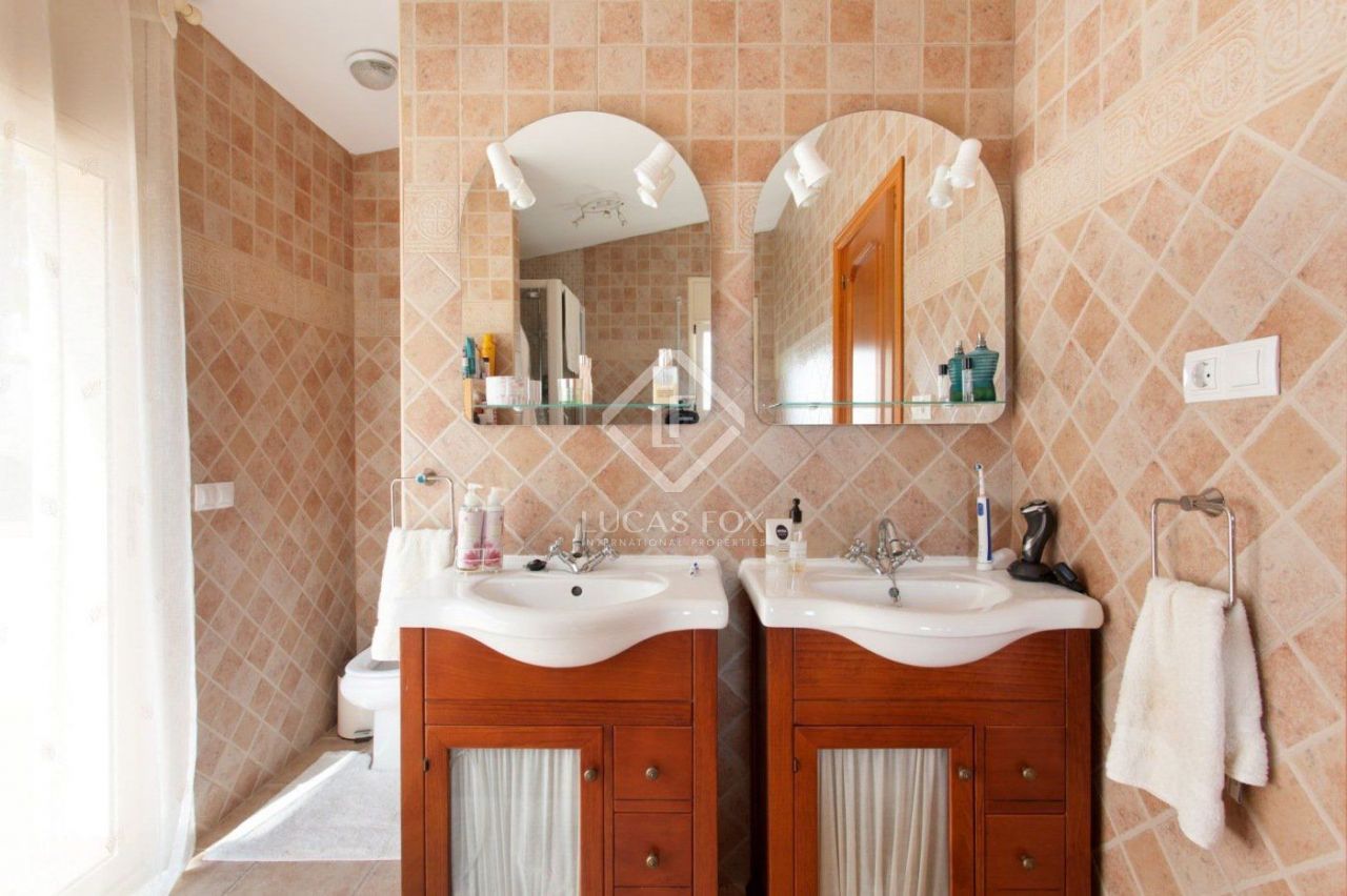 Although traditional on the outside, the house has modern interiors and offers an open plan living room – dining room with a fireplace, high vaulted ceilings and large windows with plenty of natural light. Also on this floor are the modern kitchen which is equipped with high quality fitted Siemens appliances, a large terrace, a little library and a study and access to the 2-car garage.