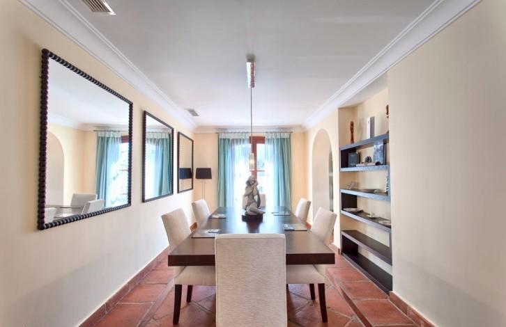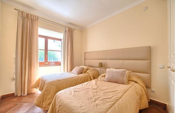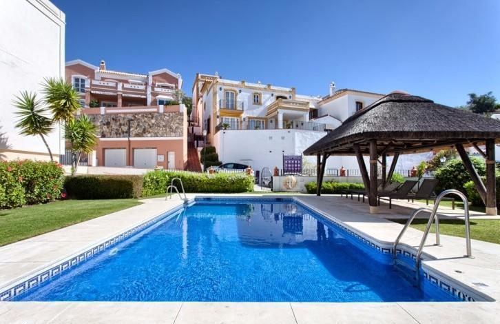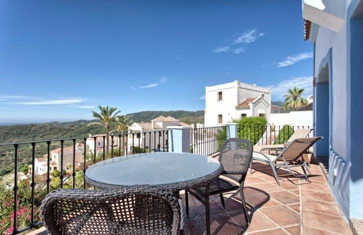 Well located and tastefully decorated townhouse with panoramic sea views and mountain views in Benahavis. In the house living room with fireplace and high ceilings, dining room, fully equipped kitchen, master bedroom with bathroom and two guest bedrooms with a shared bathroom. Direct access to the terraces. It is possible to install a small private pool. The urbanization is a communal swimming pool. Closed guarded urbanization lies next to the Golf club, Marbella Club Golf Resort. A 10-minute drive from the beach and all facilities.