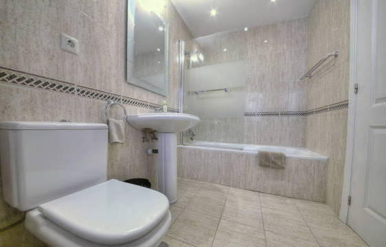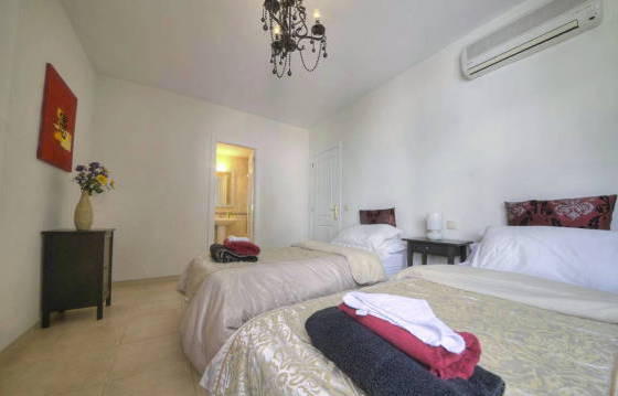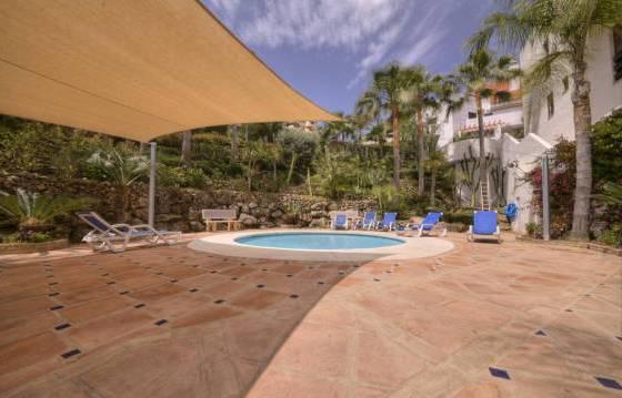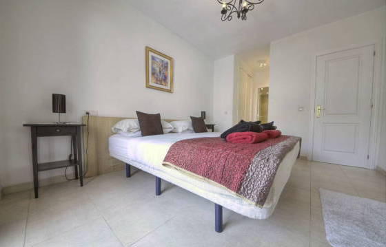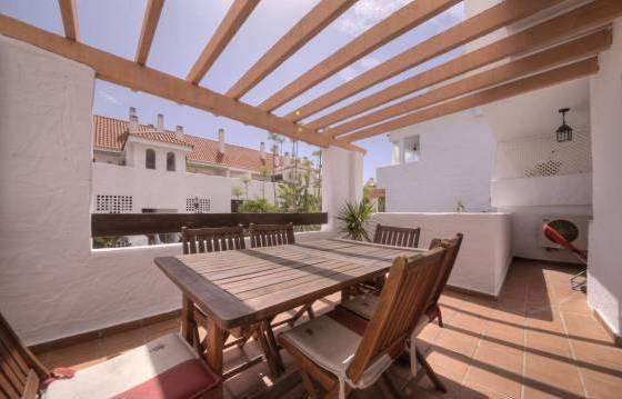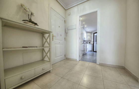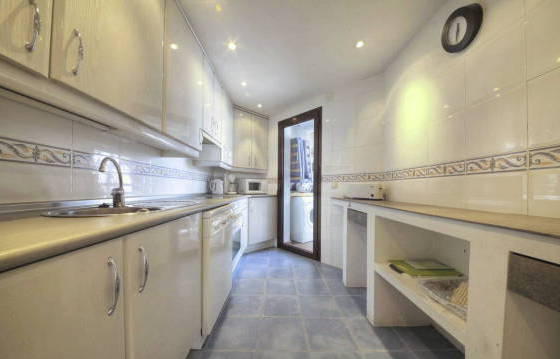 Beautiful apartment on the second floor with a large Southeast terrace, located in the heart of Nueva Andalucia, within walking distance from the supermarket, shops and restaurants. Parking in the garage hot and cold air conditioning. The well-kept apartment complex with security and 2 swimming pools (one heated). The apartment consists of an entrance hall leading to a large dining room and living room with direct access to the terrace, to wield a kitchen with integrated oven, hob, washing machine, dishwasher and fridge freezer. Utility room with washing machine. The master bedroom with dressing room, fitted wardrobes, bathroom and direct access to the terrace. Guest bedroom with fitted wardrobes and a bathroom. Tiled floors, double glazing and hot and cold air conditioning. Parking space in the garage. Area 115m2