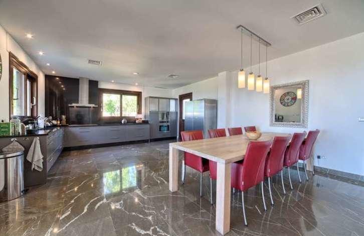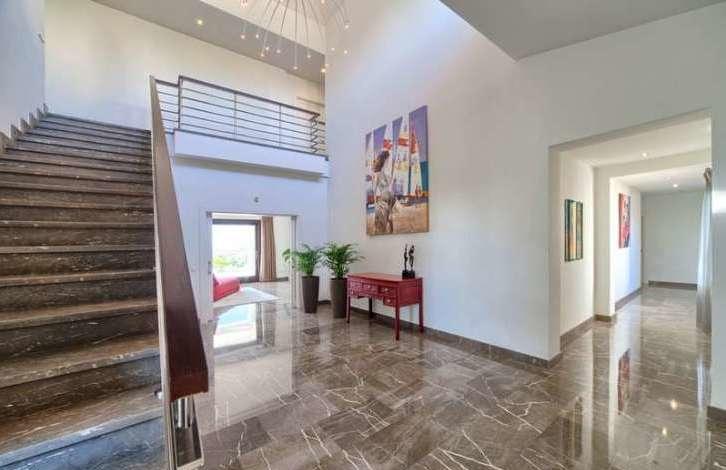 На первом этаже: огромный холл; гостиная/столовая с выходом на террасу и в сад с бассейном, где моно наслаждаться великолепным видом на море; кухня открытой планировки с высоким качеством Küpperbusch бытовой техникой; кабинет; 2 спальни с общей ванной комнатой; гараж на 3 машины.