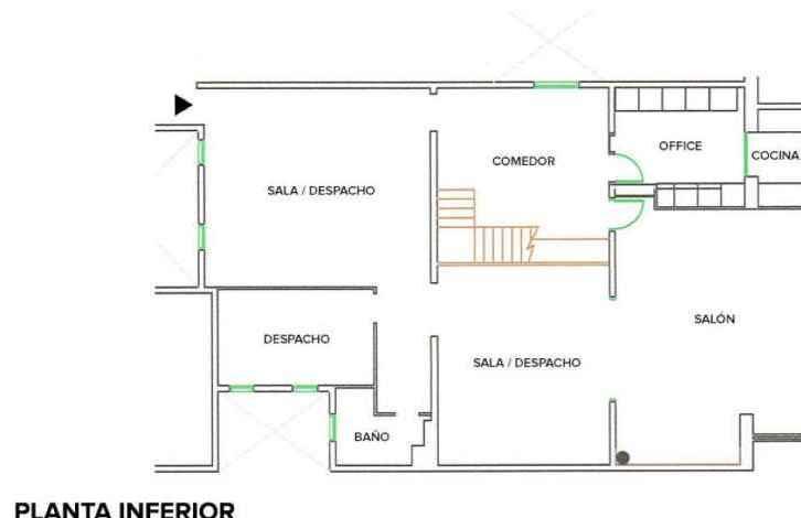 On the first floor with an area of 154m2 there are 2 living rooms and 2 offices, a kitchen and a dining room. On the second floor, an area of 99m2, there is a living room, 4 bedrooms, 2 bathrooms, a laundry room and a terrace of 26m2.