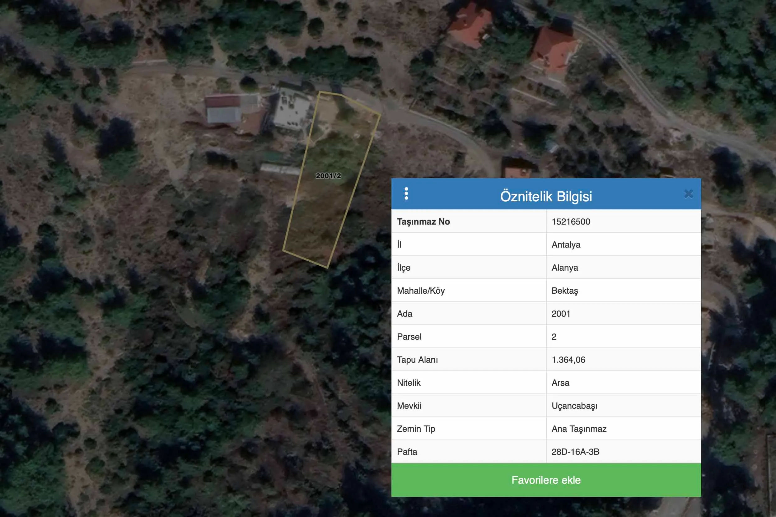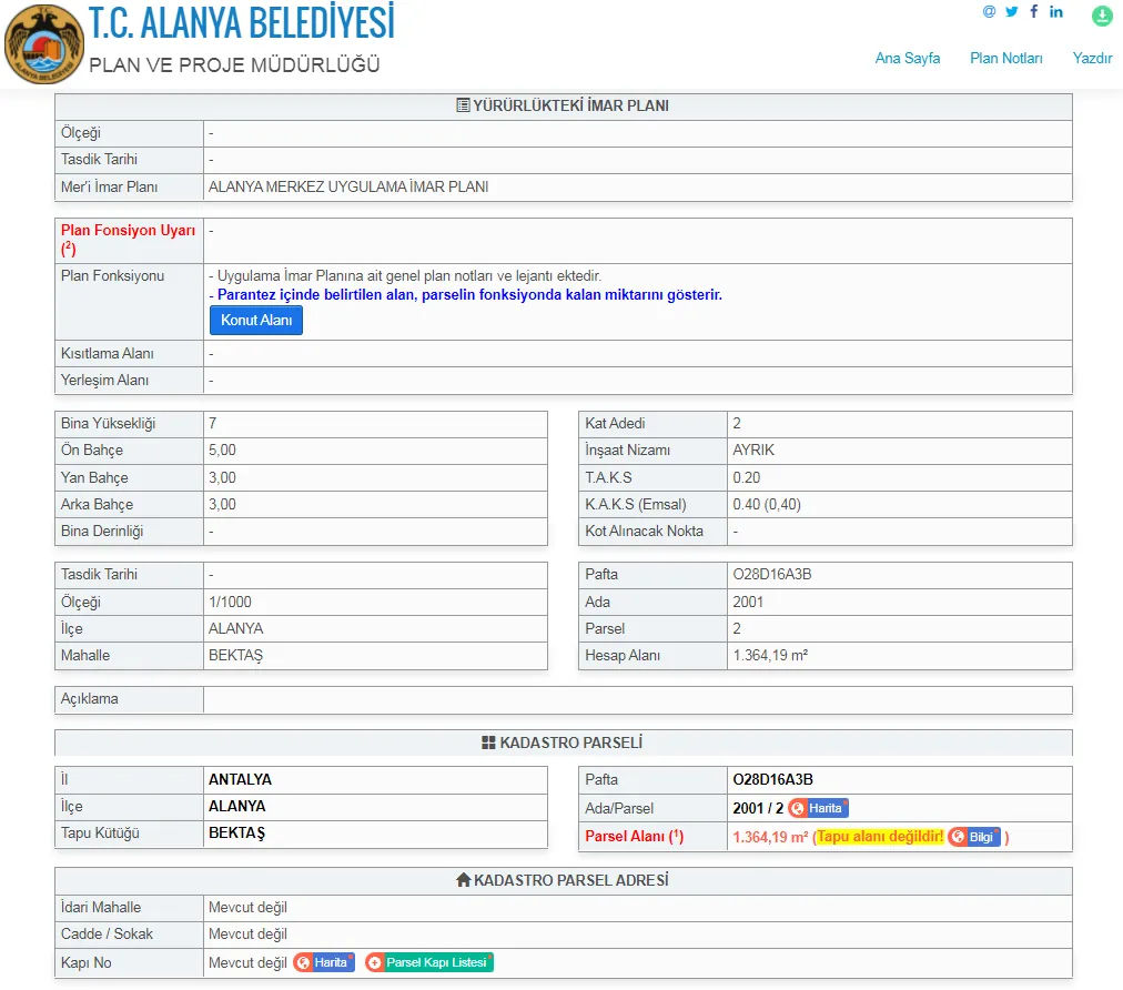 • Property Type Land For Sale • Zoning Status Villa • m² 1,364 • m² Price 1.496 • Island No 2001 • Parcel No 2 • Sheet Number Not Specified • Kaks (Precedent) Not Specified • Clearance Not Specified • Title Deed Status Detached Parcel • Flat for Flat No • Credit Eligibility Yes • From Real Estate Office • Trade YesOur zoned land is for sale in Bektaş Neighborhood with the most beautiful view in the north of Alanya. The land, which is suitable for credit and exchange, has the title deed information of plot no.2001 plot 2. There is a 2.5-fold zoning permit for 20% of the land, which is 1,364 m2 in total. It has a construction area of 272.80 m2. It has electricity and water, and it draws attention with its sea, nature and city views. It is an opportunity not to be missed as an investment. The land has a road, it is 10 km from the sea and the city center. There are villas and residential areas around it.