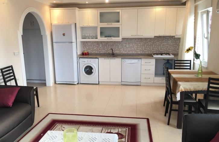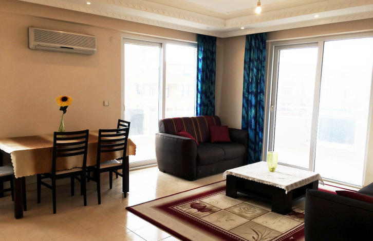 Apartment 2 + 1 in the complex, located in the area of the Tuesday market in the resort of Mahmutlar. The sea is 350 m., The center of Mahmuilara is 700 m. The apartment is located on the 5th floor, totaling 9 floors. The apartment is fully prepared for living, furnished with furniture and appliances of good quality. The apartment has 2 bedrooms, living room with kitchen, two bathrooms and two balconies. The apartment faces south and east.