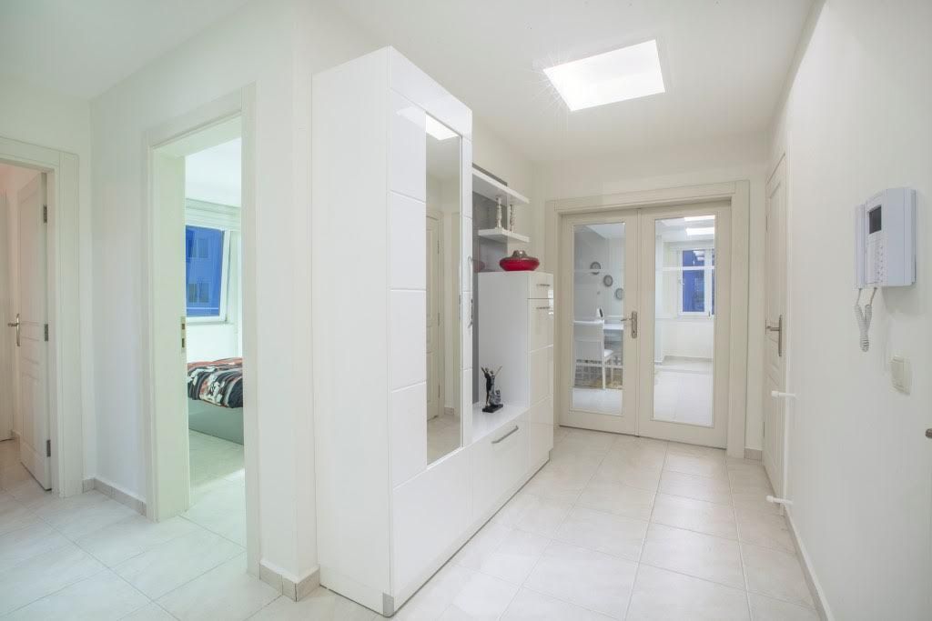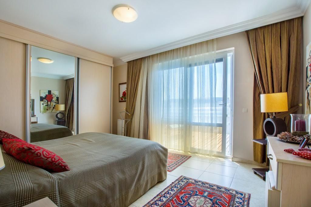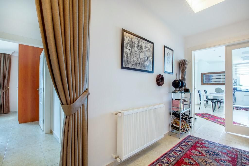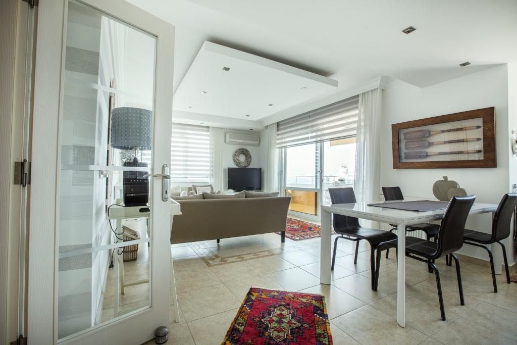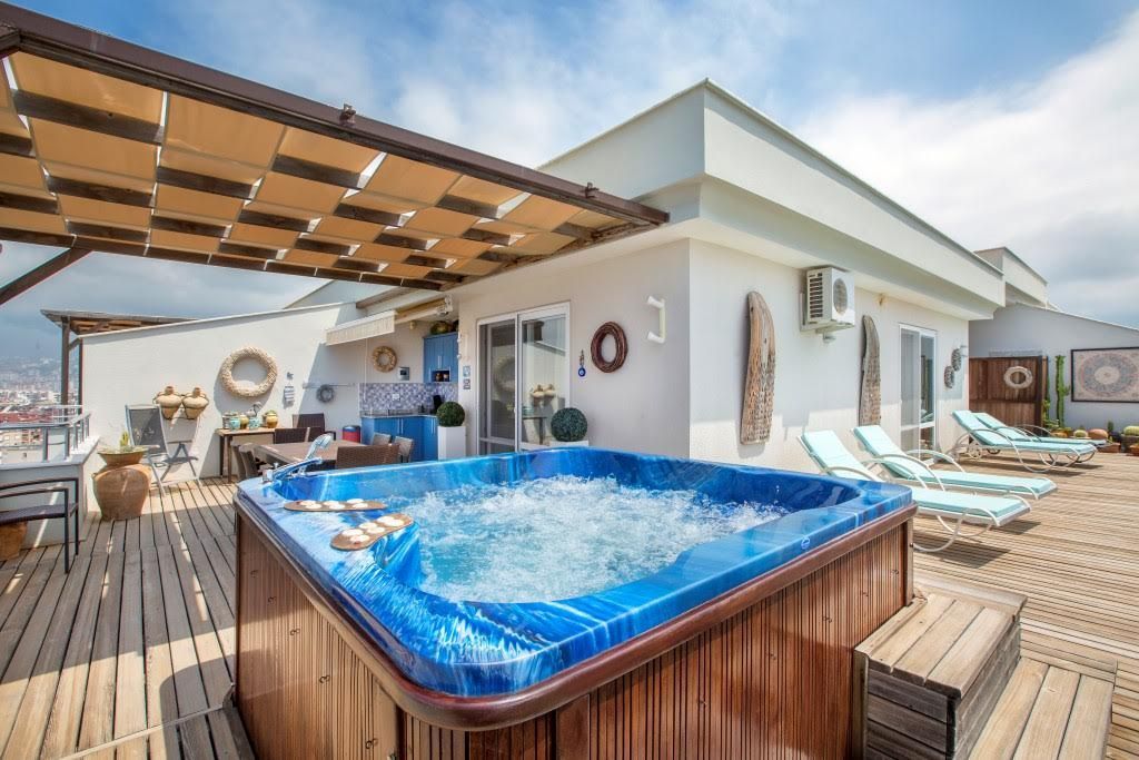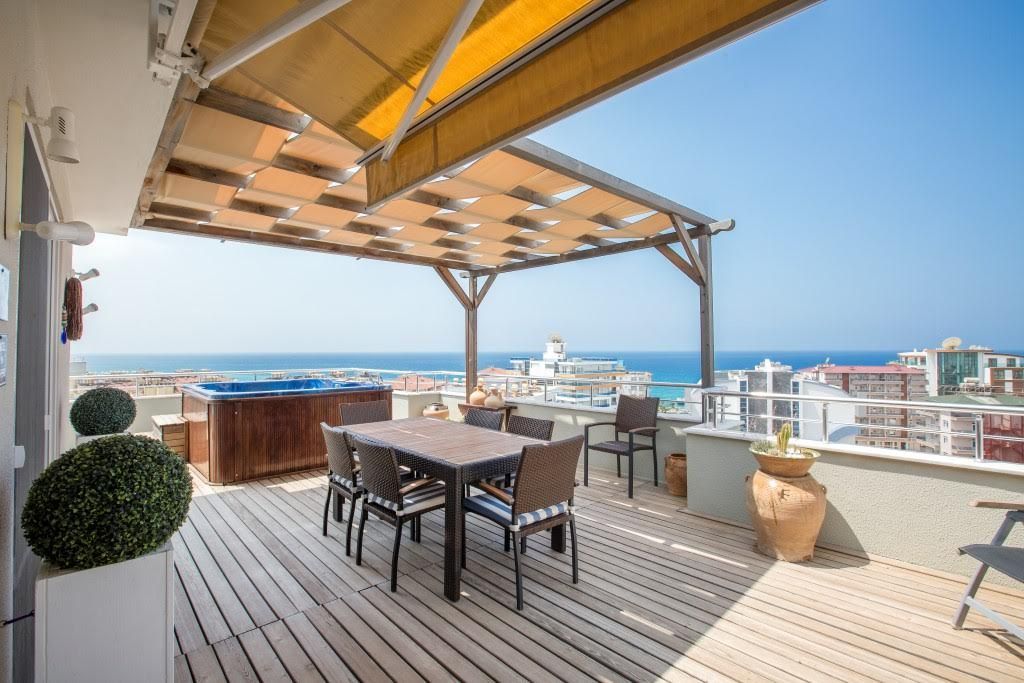 Penthouse 4 + 1 (230 m²), 2 floors: living room with kitchen, 4 bedrooms, 2 bathrooms, jacuzzi in the bathroom, storage room, 2 balconies on the ground floor and a large terrace upstairs with kitchen and panoramic sea view, mountains And the center of Alanya.