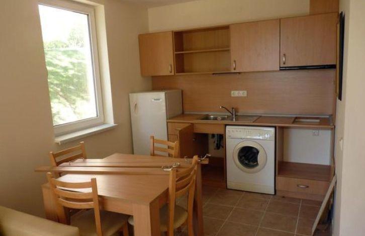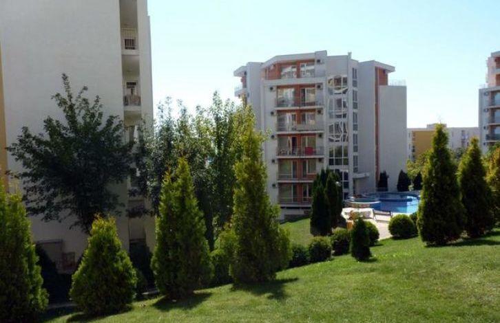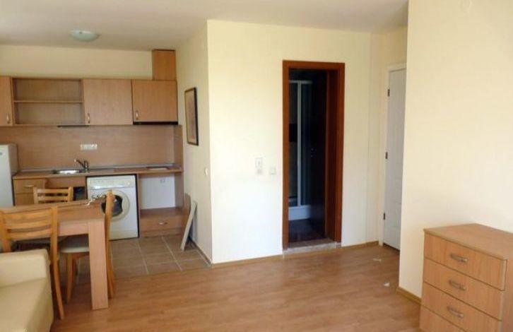 Полностью меблированная квартира-студио расположена в апарт-отеле Crown Fort Club. Комплекс находятся в тихой бухте Свети Влас, в 7-ми минутах езды на такси или автобусе от отлично оборудованного курорта Солнечный берег, расположен в природном парке с дубами и соснами. Вид - на комплекс.