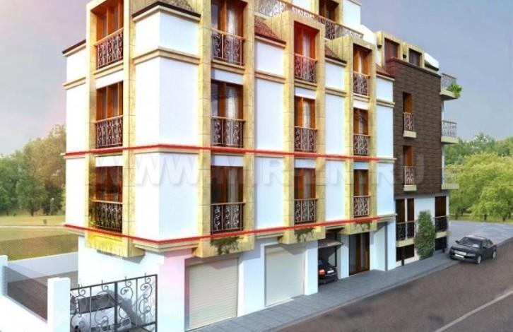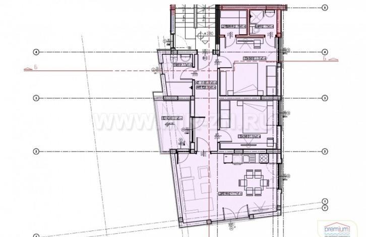 Квартира на первом этаже: прихожая, совм. санузел, спальня, гостиная с кухней, спальня с собственным санузлом и гардеробом, балкон. Площадь апартамента 133,8 кв.м.