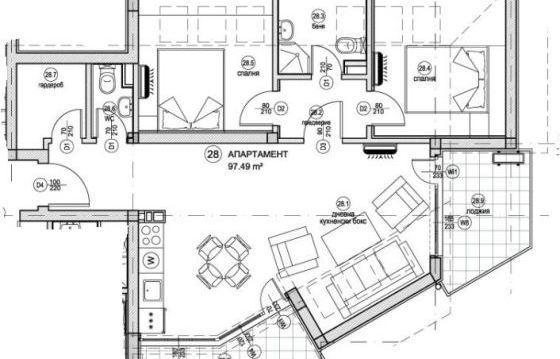 Апартамент расположен на 4-м этаже здания, откуда открывается красивый вид на море. Квартира состоит из просторной гостиной с кухней, двух спален, ванной комнаты, туалета, гардеробной, двух террас.