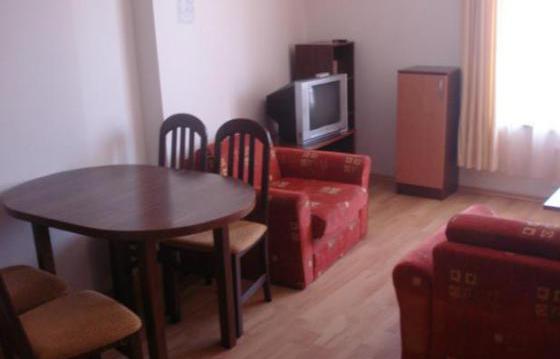 Гостиная обставлена диваном, креслами, журнальным столиком, телевизором, столовая с обеденным столом и четырьмя стульями.