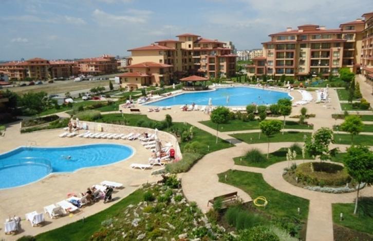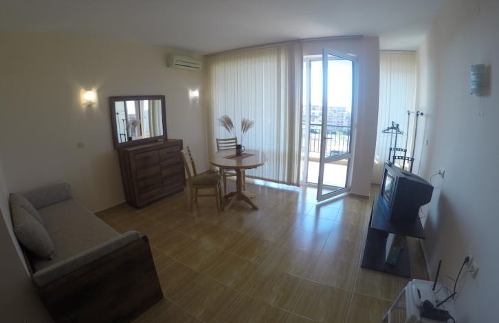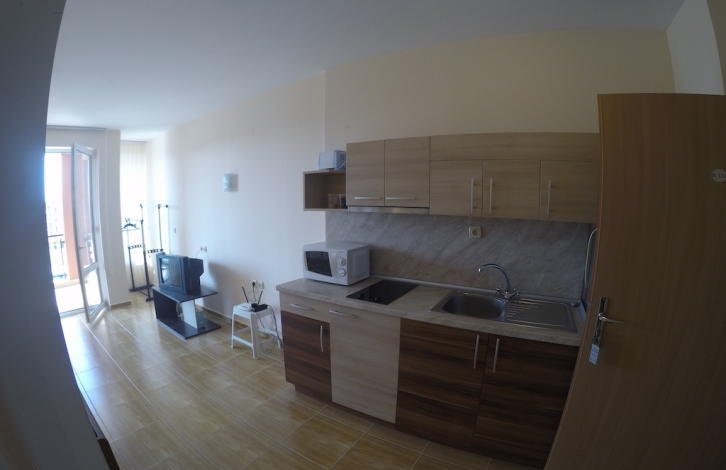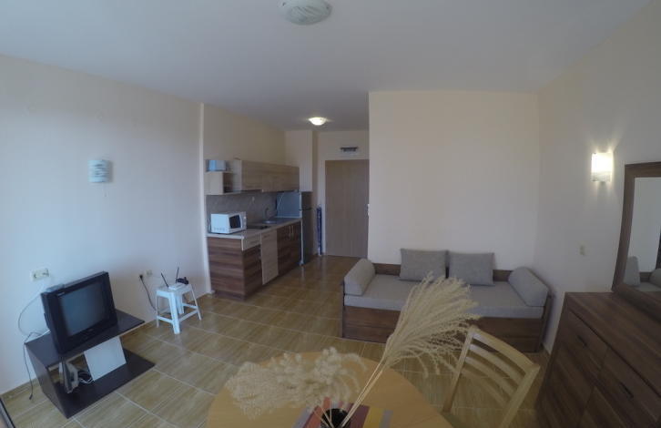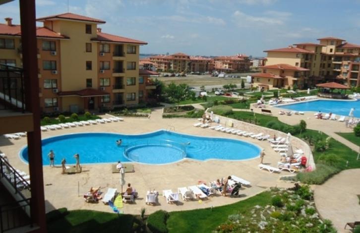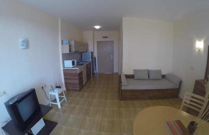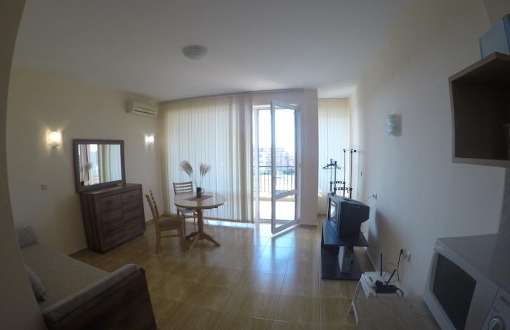 До пляжа можно дойти за 5 минут. В шаговой доступности расположен центр Святого Власа со всей необходимой инфраструктурой. Комплекс состоит из трех самостоятельных корпусов, которые отличаются оригинальной архитектурой. Инфраструктура: два прекрасный бассейна с детскими секциями, магазины, СПА-центр, лобби-бар, пул-бар, детская игровая площадка, прачечная, круглосуточная охрана, автостоянка и прочее. Территория, прилегающая к зданиями искусно облагорожена и озеленена. Имеется Акт № 16. Квартира, представляющая собой уютную студию, находится на третьем этаже. Застроенная площадь квартиры - 39, 20 кв. Общая площадь квартиры составляет 47, 97 кв. Квартира продается с мебелью. Планировка: прихожая, просторная комната с местом для кухни и отдыха, балкон, ванная комната с туалетом. Квартира стоит 33 900 евро.