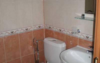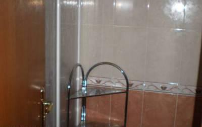 Душевая: туалет, керамические плитки на полу и частично на стенах, электрический бойлер, душ-кабина, мойка с зеркалом.
