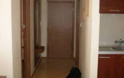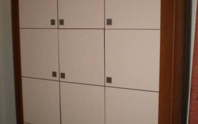 Прихожая: домофон, керамические плитки на полу и шкаф с зеркалом.