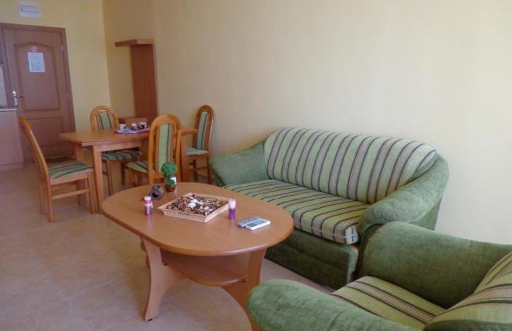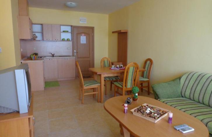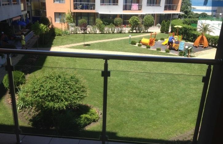 Комплекс, в котором находится недвижимость, находится в центре курорта Солнечный берег. Расстояние до пляжа около 300 м. В пешей доступности имеются разнообразные магазины, кафе, рестораны, медицинский центр, остановка общественного транспорта. Квартира, предлагаемая на продажу, расположена на втором этаже здания. Общая площадь двухкомнатной квартиры составляет 80, 80 кв. м. Планировка: светлая и уютная гостиная комната с кухонным боксом, просторная спальня, ванная комната с туалетом, отдельный туалет, большой балкон. Квартира имеет вид на плавательный бассейн. Светлая, ухоженная и просторная. Квартира продается с имеющейся мебелью и техникой. Жилье готово для заселения. В комплексе имеется своя собственная большая облагороженная территория, на которой находится бассейн, салон красоты, фитнес-зал, обмен валюты, медицинский кабинет, водные горки. Парковка. Оеспечена охрана и видеонаблюдение. Такса обслуживания составляет 8 евро за кв. м общей площади в год (без НДС). Квартира стоит 37 800 евро.