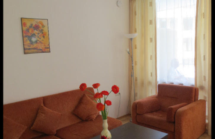 Квартира, общей площадью 61 кв. м, расположена на втором этаже. Она состоит из прихожей, гостиной с кухней, спальни, ванной комнаты с туалетом, двух балконов с видом на бассейн.