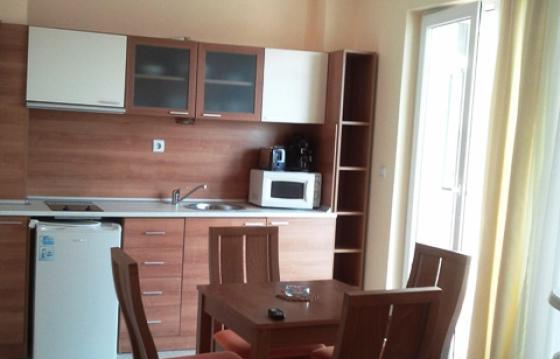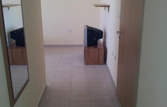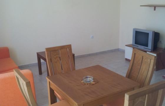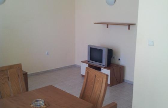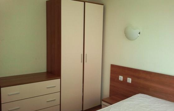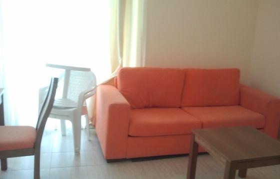 В спальне имеется 2-спальная кровать, шкаф, комод и зеркало; в гостиной - раскладывающийся диван, обеденный стол и 4 стула, тумба и TV, кухонный блок. Просторный балкон с выходом из обеих комнат и видом на бассейн.