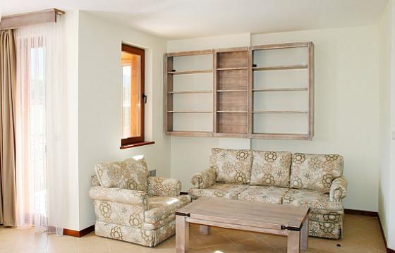 Апартамент располагает гостиной с местом для кухни, с верхними и нижними шкафами (дерево, массив – бук, кованое железо), холодильником, плитой, стиральной машиной, обеденным столом с четырьмя стульями, диваном с двумя креслами, столиком, телевизором с тумбой.