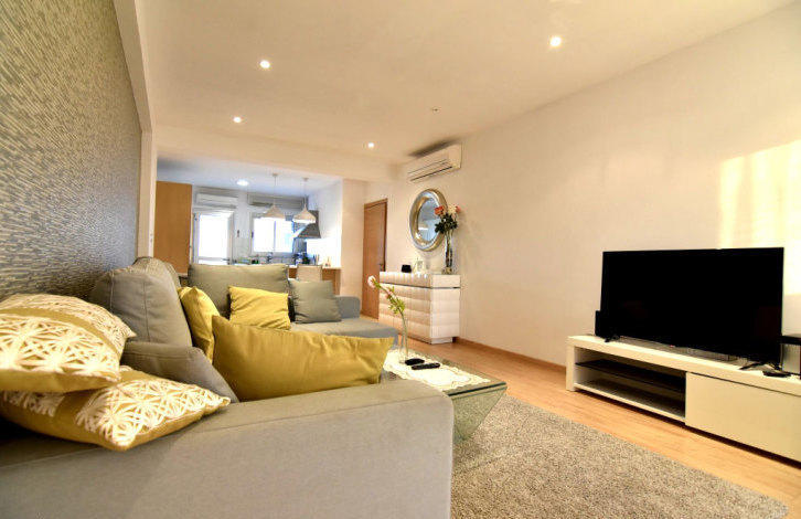 Современная 2-спальная квартира, расположенная в отличном месте через дорогу от популярного пляжа Олимпион в нескольких минутах ходьбы от торговой улицы, детских и взрослый развлекательных центров, школ. Технические характеристики: открытого плана кухня и гостиная, большая крытая веранда. На кухне есть дополнительной небольшой балкон. Охрана в комплексе 24 ч., тренажерный зал, бассейн на крыше.