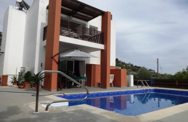 This award winning one off architect designed villa is located in the very popular area of Tsada which benefits from being just above the humidity level, very close to Tsada golf course and has fantastic panoramic views over Paphos. On the ground floor there is on open plan living area including a fully fitted Italian kitchen with appliances included. Large patio doors lead out to the veranda and pool area. Also on the ground floor is a double bedroom with fitted wardrobes, and a separate cloak/shower room. On the first floor there is a very spacious master bedroom with fitted wardrobes, spacious en-suite bathroom, and a lovely balcony overlooking the pool area and distant views. Also on this floor are two further bedrooms with fitted wardrobes and a family bathroom. The staircase then leads up to the beautiful roof level where it is crying out for a BBQ and maybe even a hot tub looking up at the stars!This home has a wealth of other benefits including full gas central heating with independent controls to each floor and radiators, air conditioning units throughout with both hot and cold facilities, double insulated cavity walls, a full damp proof course. Also the property has a water softener, granite work surfaces, full height fridge freezer, dishwasher, microwave oven/grill, and a separate oven/grill.