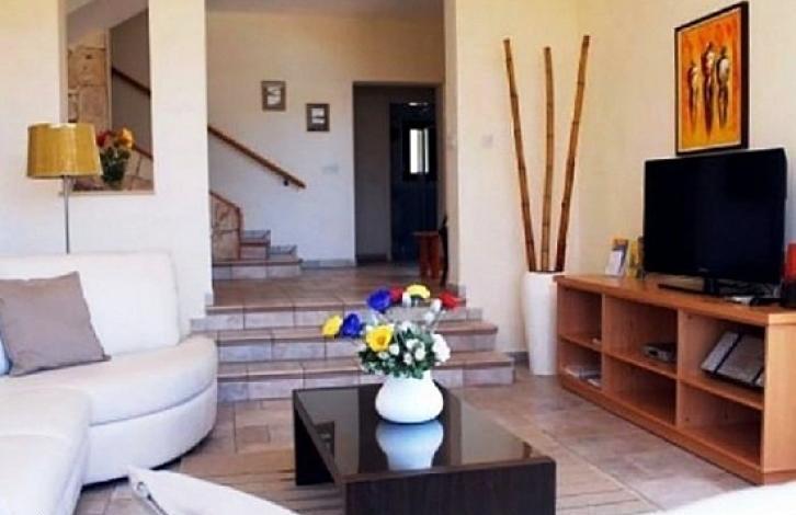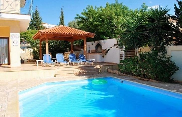 The villa is located in the exclusive private and secluded St. George , amidst lush greenery, surrounded by banana plantations in the beautiful countryside of Paphos. Set in a wonderful prime location in a cul de sac road, it enjoys magnificent views of the sea and the grassland. It is a quality built home with a very well laid out floor plan. The property boasts a large and private 5x10 pool, and an extensive garden offering a complete privacy to relax and sunbathe. Next to the kitchen and the BBQ area is an amazing gazebo ideal for all day sitting near the pool. This comfortable modern-style detached villa has been completed and furnished to the highest standards and its design, fully harmonizes with the environment in which it is located. Upper floor: There is the Master double bedroom with en suite bathroom and doors to the balcony overlooking the pool. A separate double room and a twin room share a shower room. Lower floor: Comfortable, attractively furnished lounge with doors that open onto a large pool terrace, gazebo and a barbecue area. There is also a Sauna room with whirlpool bath and a shower.