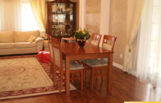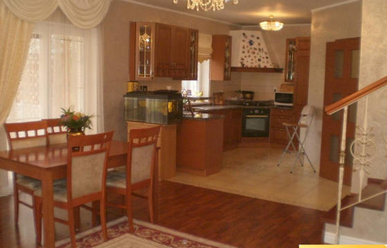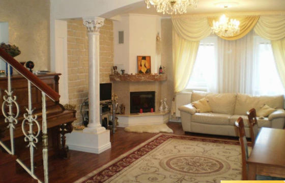 Планировка : прихожая со встроенными шкафами, большая гостиная с кухней, камином и выходом на террасу и в сад, ванная с туалетом - на первом этаже, три спальни, ванная комната с туалетом - на втором. В доме есть газовый котел, проведены все коммуникации, есть свой колодец. Дом полностью обставлен мебелью. На участке есть два парковочных места.