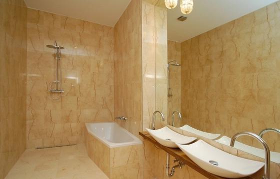 Зал совмещен с кухней и со столовой. Отдельный туалет и дополнительная мраморная ванная комната, которая оснащена двумя раковинами и вставкой из деревянных досок, а также ванная и душевая кабина.
