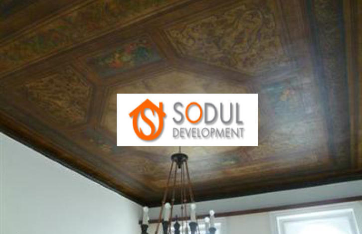 В первой комнате площадью 35 кв. м с красивым расписным потолком, качество и размеры (35 кв. м) которого в полной мере соответствует представлениям о роскоши процветающего мещанства второй половины 19-го века, в разгар неоренессанса в Чехии.