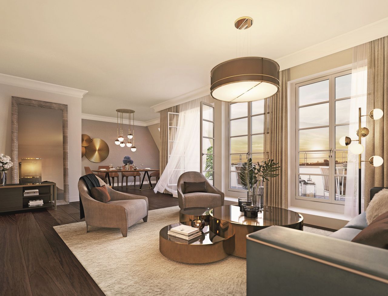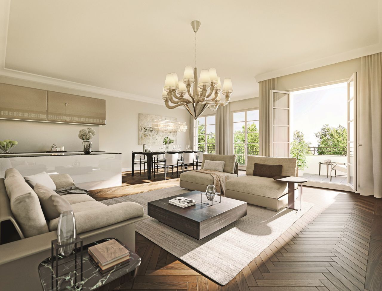 Высококлассная отделка включает в себя подогреваемые дубовые полы в жилых комнатах, полы из натурального камня и сантехнику топовых брендов в ванных комнатах, кондиционирование, систему охлаждения потолков в пентхаусах. На территории окружающего парка оборудованы зоны отдыха и детская площадка.