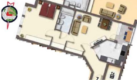 Квартира размером 67,85 м2 распределяется на гостинную комнату с выходом на балкон, спальню, американскую кухню открытого типа, ванную комнату и коридор. Состояние квартиры хорошее. За квартирой закреплено парковочное место около дома и подвальное помещение.