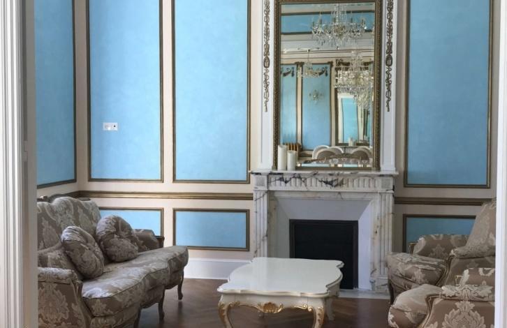 На первом этаже находятся 4 спальни и две ванные комнаты. На втором этаже двойная гостиная с лепниной и каминами, столовая, кухня и одна спальня с ванной комнатой.