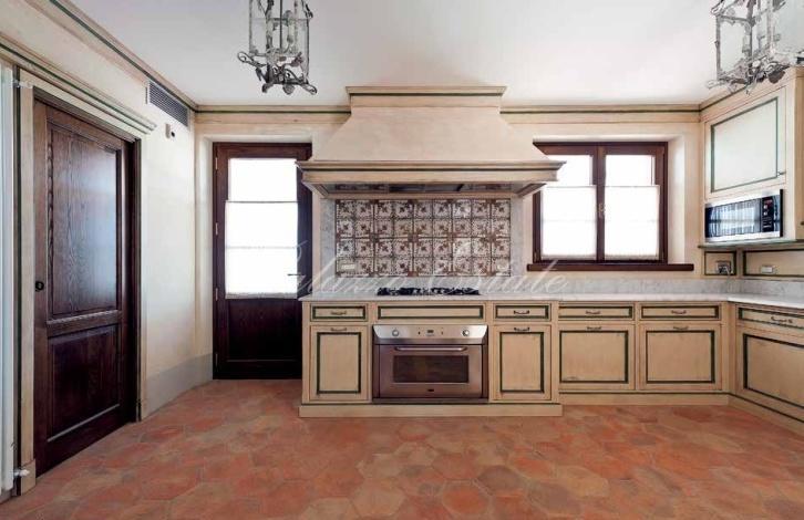 В отделке кухни и всего дома использованы только натуральные материалы: в кухне антикварная плитка ручнои работы, в комнатах и во всех гардеробных — дубовыи паркет. Ванные комнаты на первом и втором этажах отделаны натуральным мрамором, полы подогреваются.