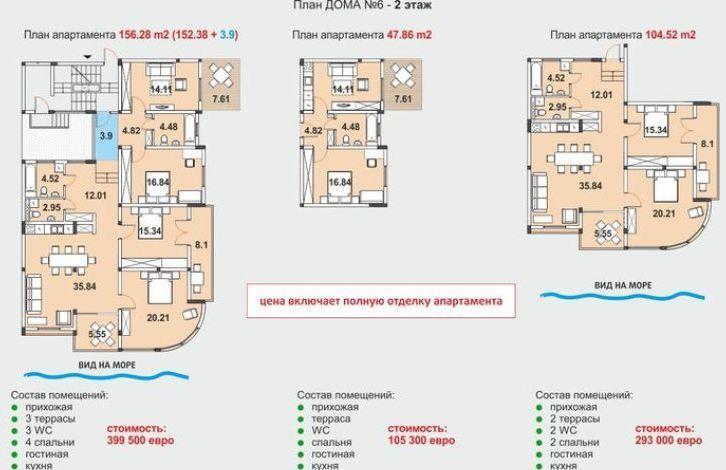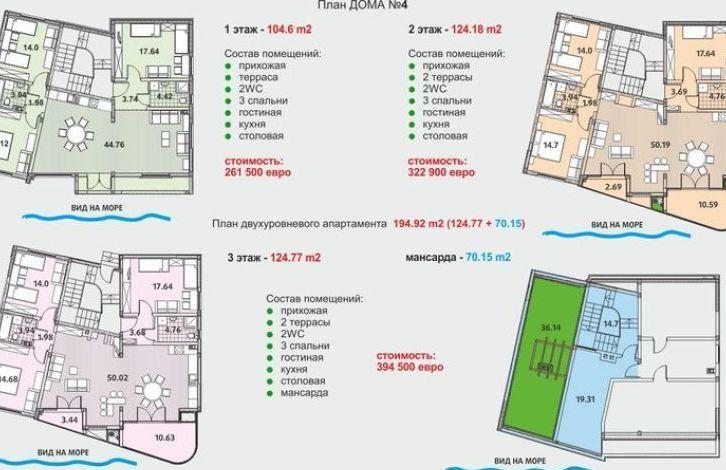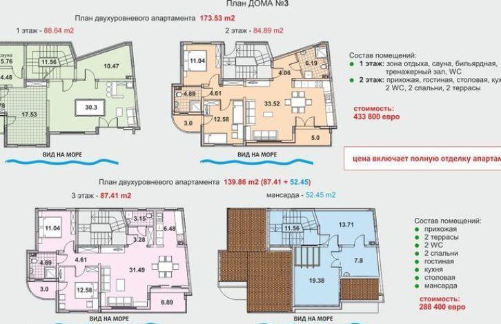 - 3-4 этаж: Двухуровневый апартамент 3-4 спальни 150,83 м2 - 244,000 евро дополнительно терраса 39,88 кв.м.