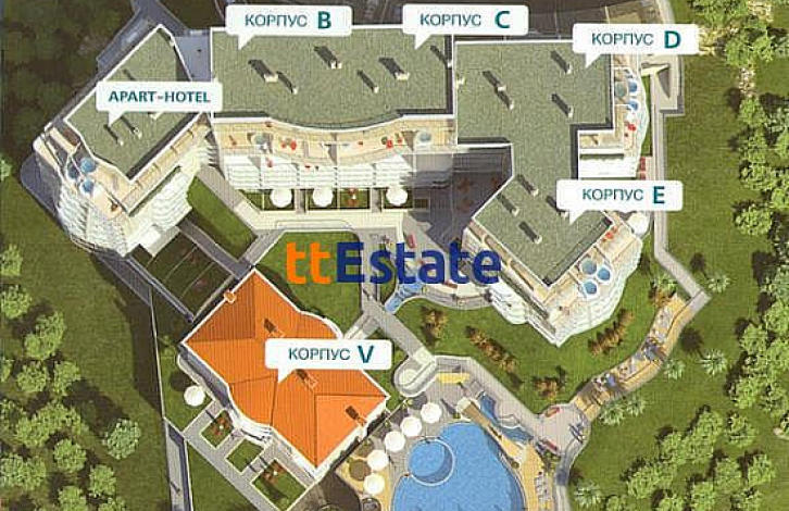 Корпус A представляет собой Апарт-отель с 34 номерами, предназначенный, в основном, для гостей, приглашенных владельцами апартаментов.