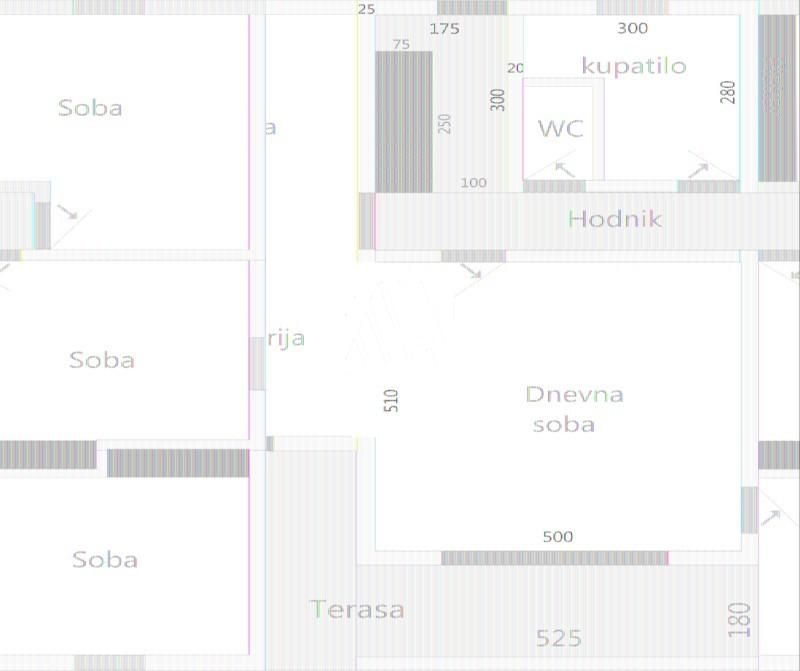 1 этаж: гостиная, кухня, обеденная зона, 3-и спальные комнаты, ванная комната, туалет, два коридора, терраса 65 кв.м., внутренняя лестница.