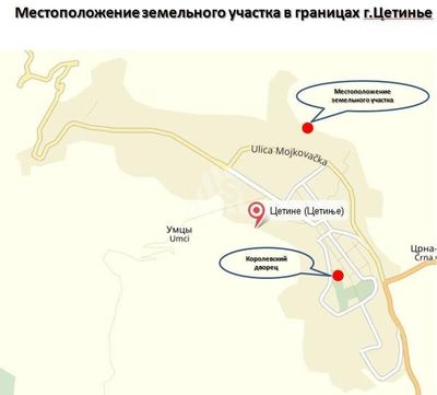 Большой ровный земельный участок площадью 16 000 м2 К участку подходит асфальтированная дорога. Есть возможность подключения электричества. Цетинье в 10 минутах на автомобиле (около 12 км).