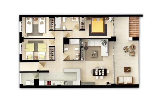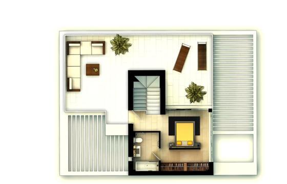 Салон, 3 спальни, 2 ванные комнаты, полуоткрытая кухня, терраса, солярий 85 м2. Пентхаус находится в комплексе, где есть общий бассейн, подземный паркинг и тропическая растительность.