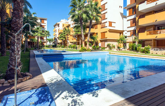 Светлые апартаменты на первом этаже (по-русски второй) в комплексе Ла-Реколета жилого района Сеньорио-де-Пунта-Прима, Торревьеха. Cалон-столовая, оснащенная техникой американская кухня, 2 просторные спальни со встроенными шкафами, 2 ванные комнаты, одна из которых ен-сюит. В апартаментах есть система кондиционирования, домофон, полы устланы мрамором, полы в ванных комнатах с подогревом, терраса 13 м2, обращенная на восток и с видом на бассейн. В стоимость входят парковочное место в подземном гараже и кладовая. В здании есть лифт, ведущий из паркинга к квартирам. Квартира продается без мебели.