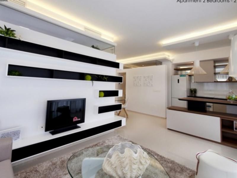 Каждая квартира имеет либо собственный сад, террасу или пентхаусы с просторным солярием- все апартаменты с видом на море.