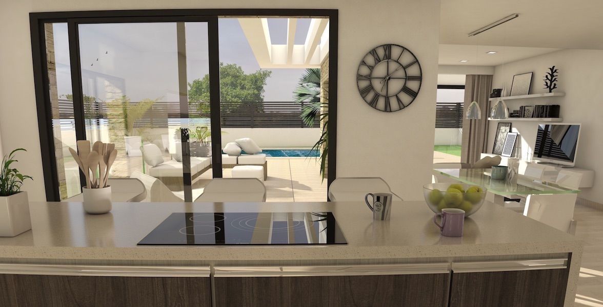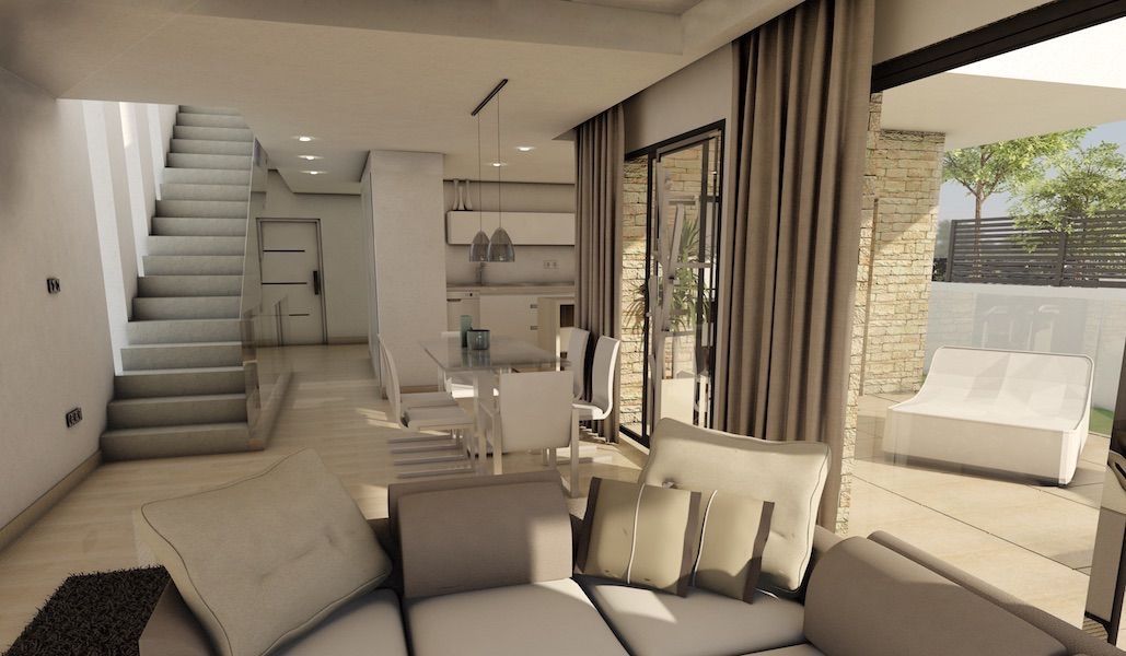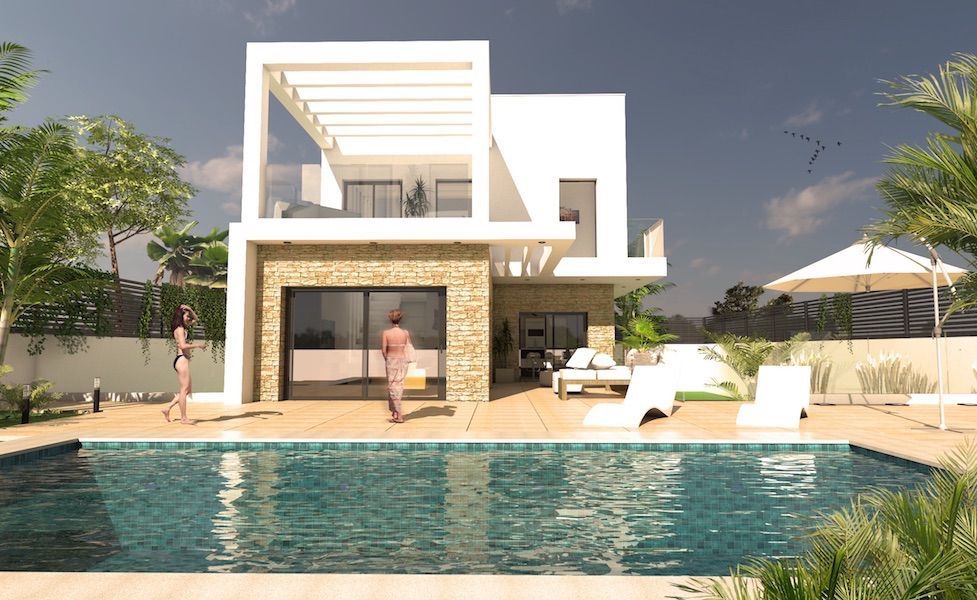 Первый этаж состоит из вестибюля, салона, столовой, кухни, 1 спальной комнаты и ванной, а так же лестницы, ведущей на второй этаж и подвальное помещение. Второй этаж состоит из 3 спальных комнат и 3 ванных, 2 террас и лестницы, ведущей на солярий. Плавательный бассейн 8 Х 4м2.