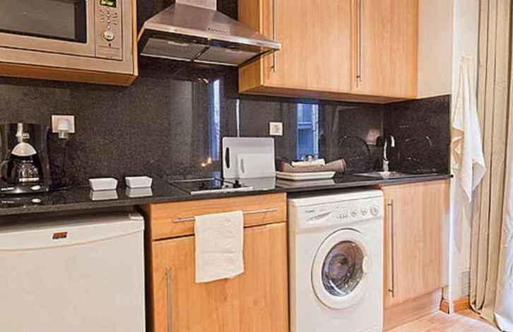 Квартира имеет площадь 40м2 с 1 спальной комнатой и 1 ванной. Это квартира открытой планировки: кухня и спальня не отделены стеной от гостиной комнаты. Спальная комната имеет двухместную кровать и большой шкаф. Гостиная-столовая располагает дополнительными спальными местами: диван-кровать на 2 человека, обеденным столом, ТВ и DVD-проигрывателем. Кухня полностью оборудована бытовой техникой. Квартира продаётся в отличном состоянии: паркетный пол, кондиционер, отопление.