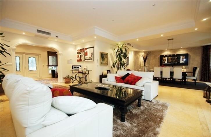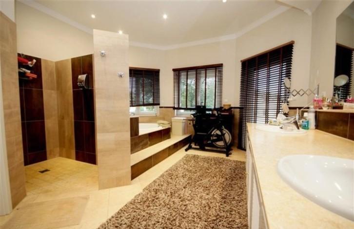 Вилла стоит на участке 1 200 м2.На первом этаже расположена прихожая, зона столовой - обе с видом на террасу и бассейн, кухня с зоной для завтрака, гостиная-кабинет, винная комната, комнаты для персонала и игровая.На втором этаже расположены 3 спальни с ванными комнатами. Все ванные имеют теплые полы.