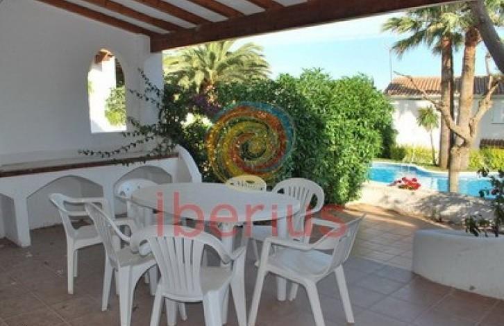 IBER-AD-029. Дом в шаговой доступности от пляжа.Планировка: первый этаж - прихожая, гостиная с камином и выходом на террасу, спальная комната, санузел.Второй этаж - две спальни и терраса с видом на бассейн и море.