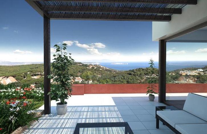 Современная двухэтажная вилла с великолепными видами на острова Медес и залив Бегур. Стены с большим количеством стекла, что дает много света и позволяет постоянно любоваться красотами бухты из всех окон дома. Вход в дом с улицы через второй этаж.
