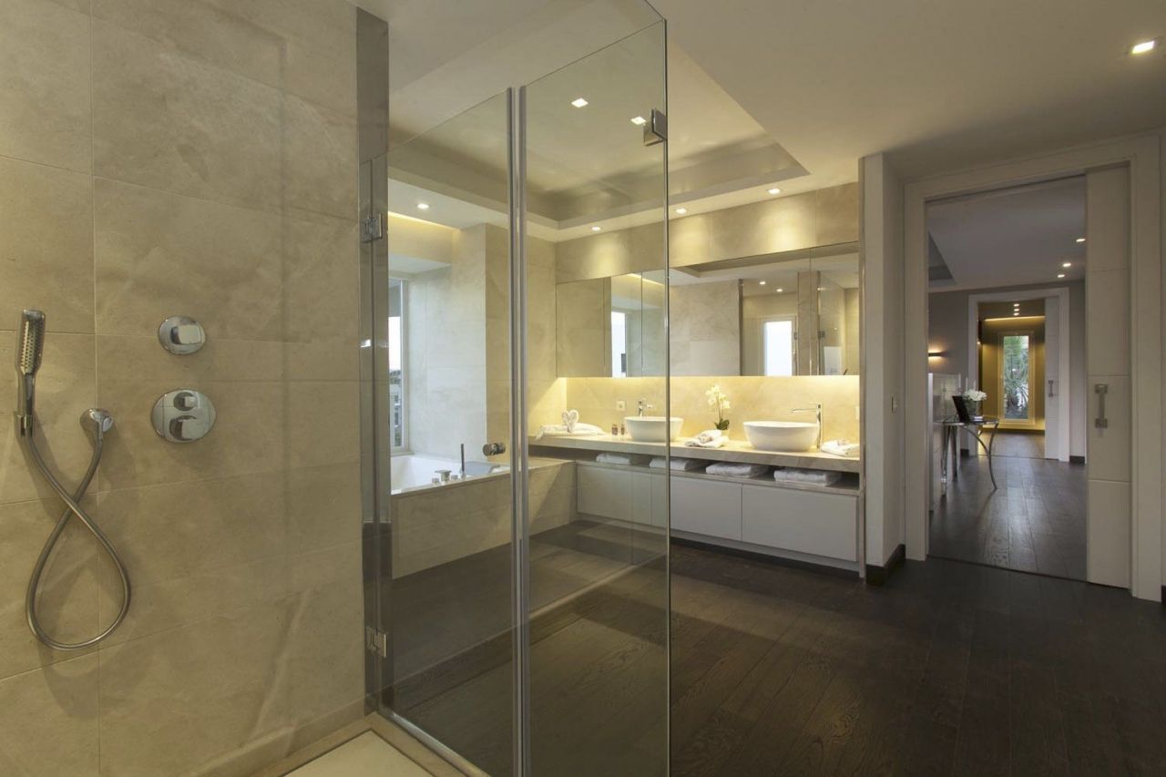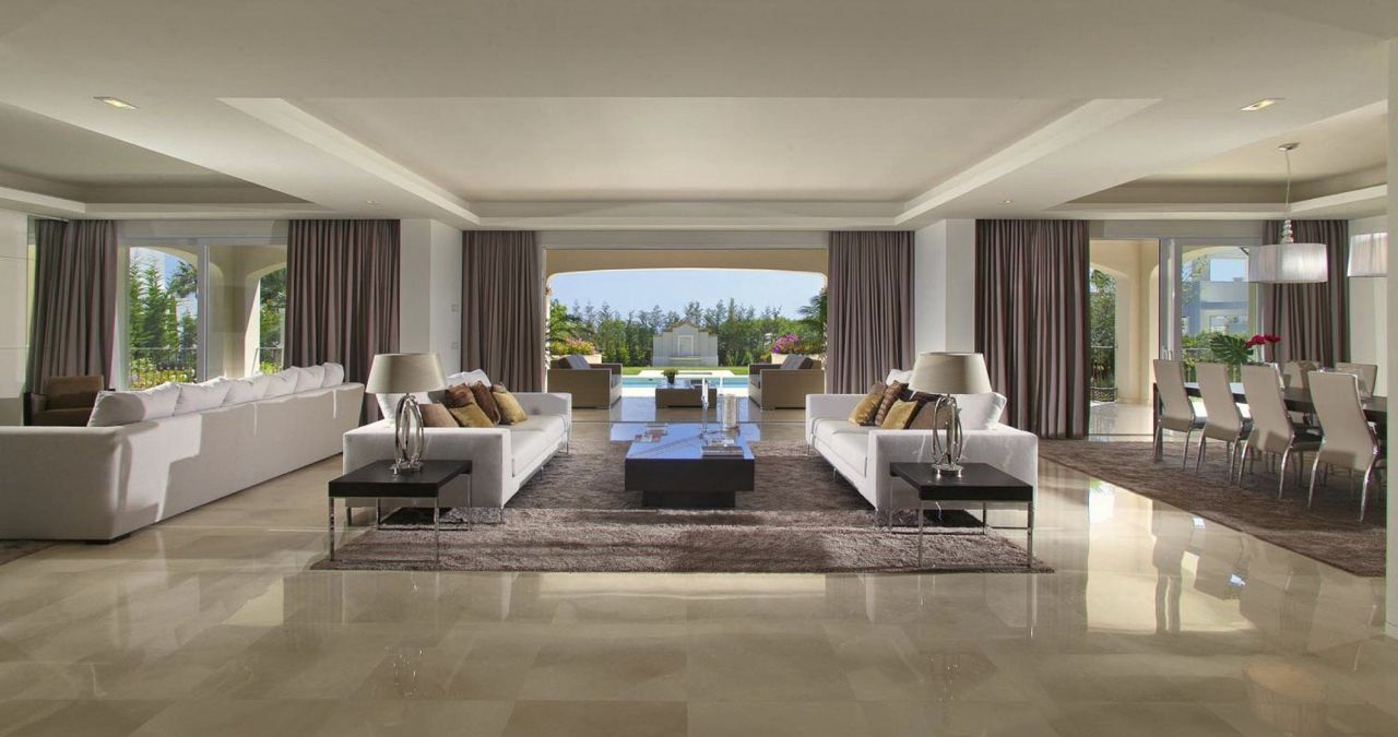 В гостиной, в кабинете, в 5 спальнях и 6 ванных комнатах, соблюдается стиль и использован. Установлена система кондиционирования, Интернет, система подогрева полов во всем доме, полностью оборудованная кухня и столовая. На нижнем этаже расположены вспомогательные помещения, плюс гараж. Современная система сигнализации, охрана 24 часа в сутки.